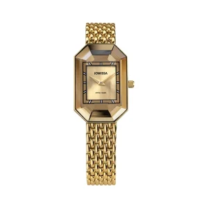 ویژگی ها : مناسب برای: بانوان ملیت برند : سوییس ارتفاع قاب: 10 میلی متر مقاومت در برابر آب : 5 اتمسفر فرم هندسی قاب : بیضی نوع صفحه نمایش : عقربه ایی جنس شیشه : کریستال معدنی رنگ صفحه : طلایی تمام استیل ضد زنگ